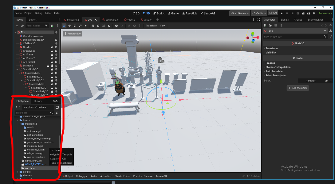 Under levels in the file system, navigate to 'zoo.tscn' and open it to view the scene with all of the game assets, then go to entities in the file system, locate your new asset tscn and click and drag it into the zoo scene to see it next to everything in the game! (yay!)