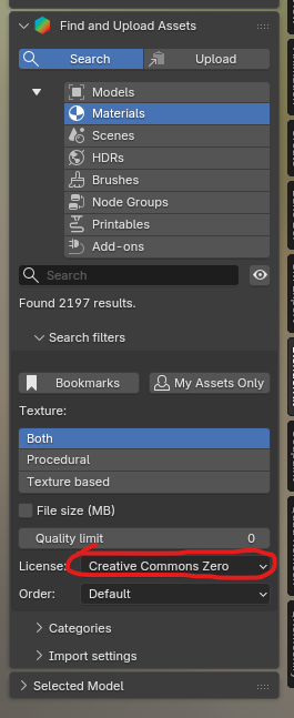 When using blenderkit please check preapproved materials list first! But if you want to explore ones we haven't tested, just make sure you limit search results to CC0 in the filters.