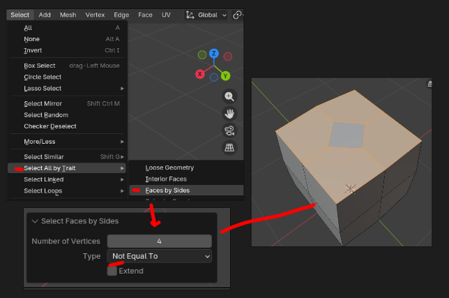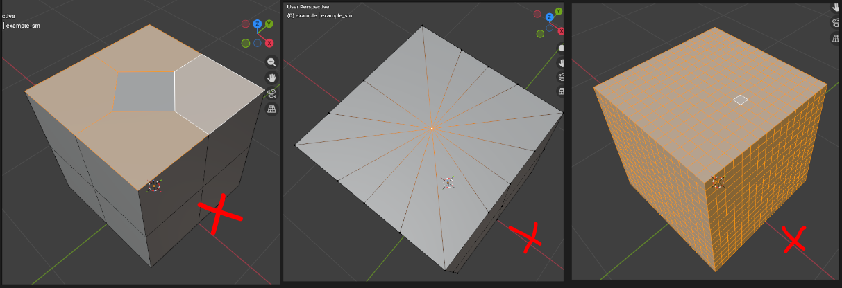 Identify where your topology needs to be repaired! Signs of bad topo are N-gons (left), poles (middle), and unnecessary loops (right)