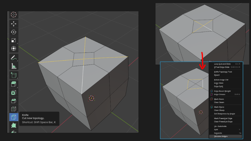 Solutions include cutting strategically with the knife tool to turn n-gons into quads (left), or re-directing edges + dissolving unnecessary cuts (right)