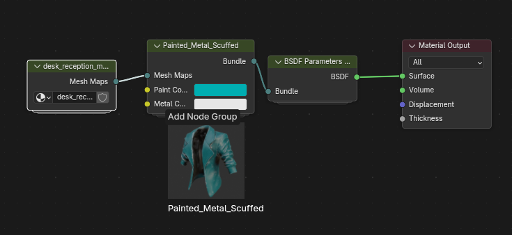 Now, back in your asset browser- drag and drop the BSDF parameter to shader node group into the shader graph and conenct it to the material output