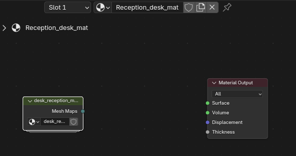 with that added, the area in between is where you can drag + drop desired materials from the asset library! just connect the mesh maps to material node to BSDF parameters node- then you can edit the color of the material you'd like to use from the library