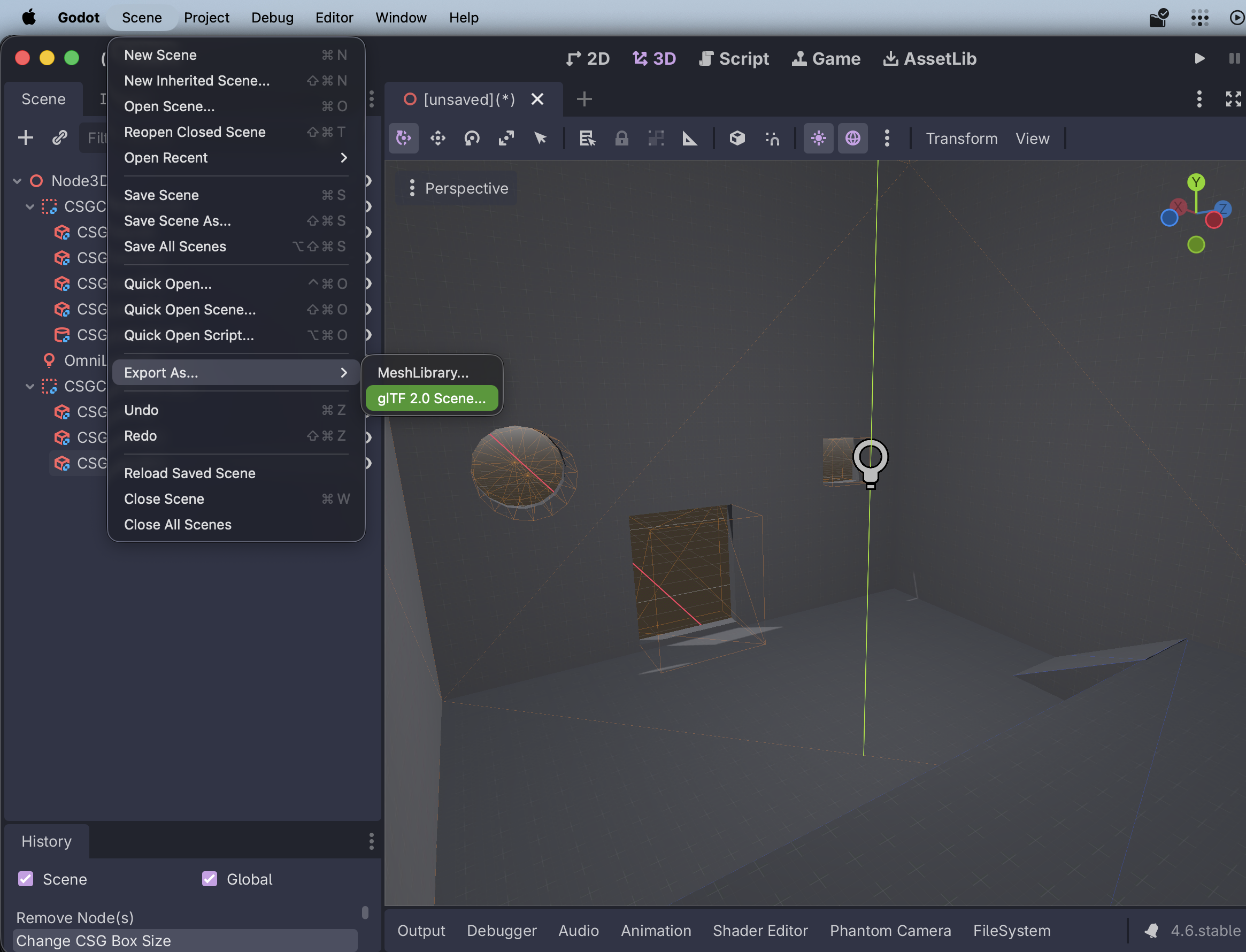 That means that you should be pretty sure that your CSG layout is how you want it before exporting it from Godot.