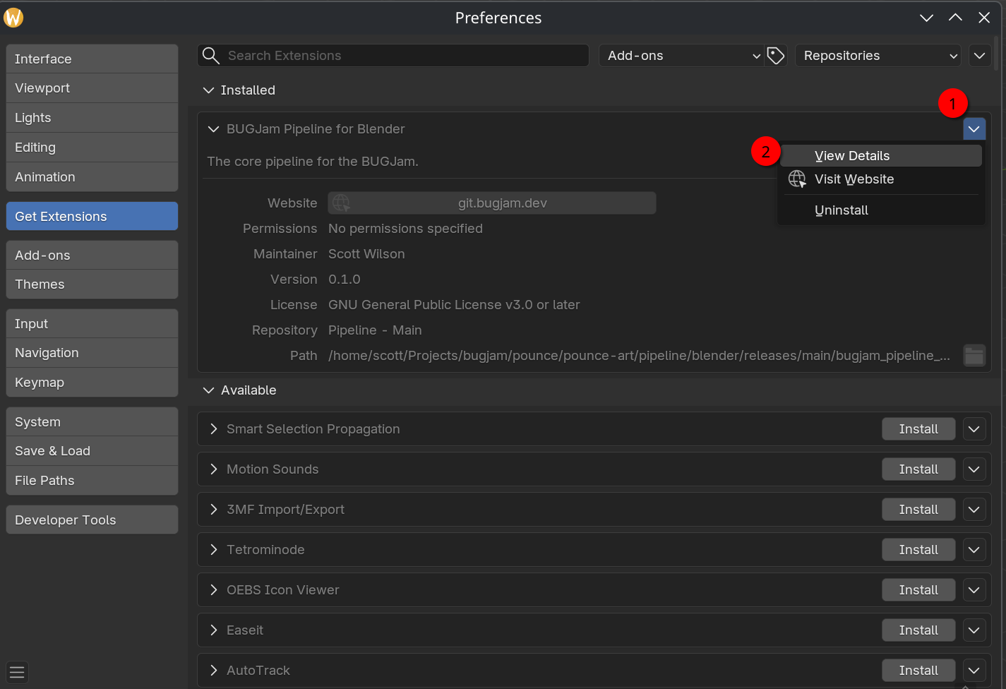 The BUGJam Pipeline for Blender should be listed under installed, but greyed out. Press the down arrow on the right, and select View Details.