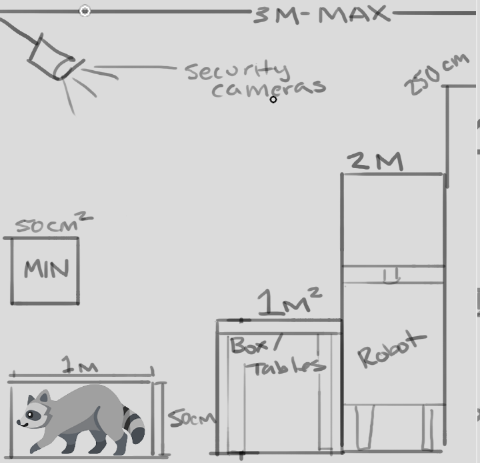 Larger characters and elements, like the security robots, should be a max of 2m tall. Security cameras should be placed at 3m above the ground to be visible to the tanuki but out of reach. Non-interactive elements will be a max of 250cm tall to fit within frame