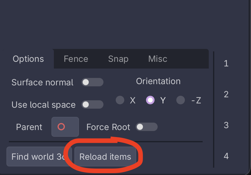 - Click "Reload items" in the Scene Builder tab's options to show the new item